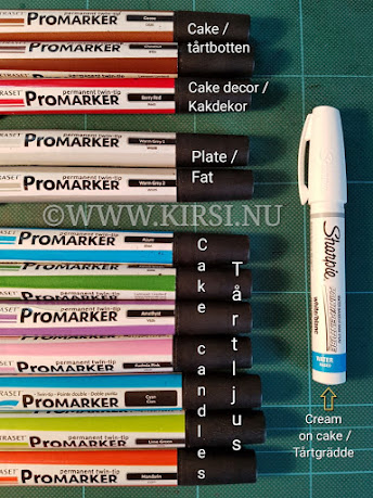 Started with the cats. Drawed them and the birthday cake. Coloured with Promarkers (se picture below). On the tounges and the candleligth flames I hade some Wink of stella clear 999 för glitter.